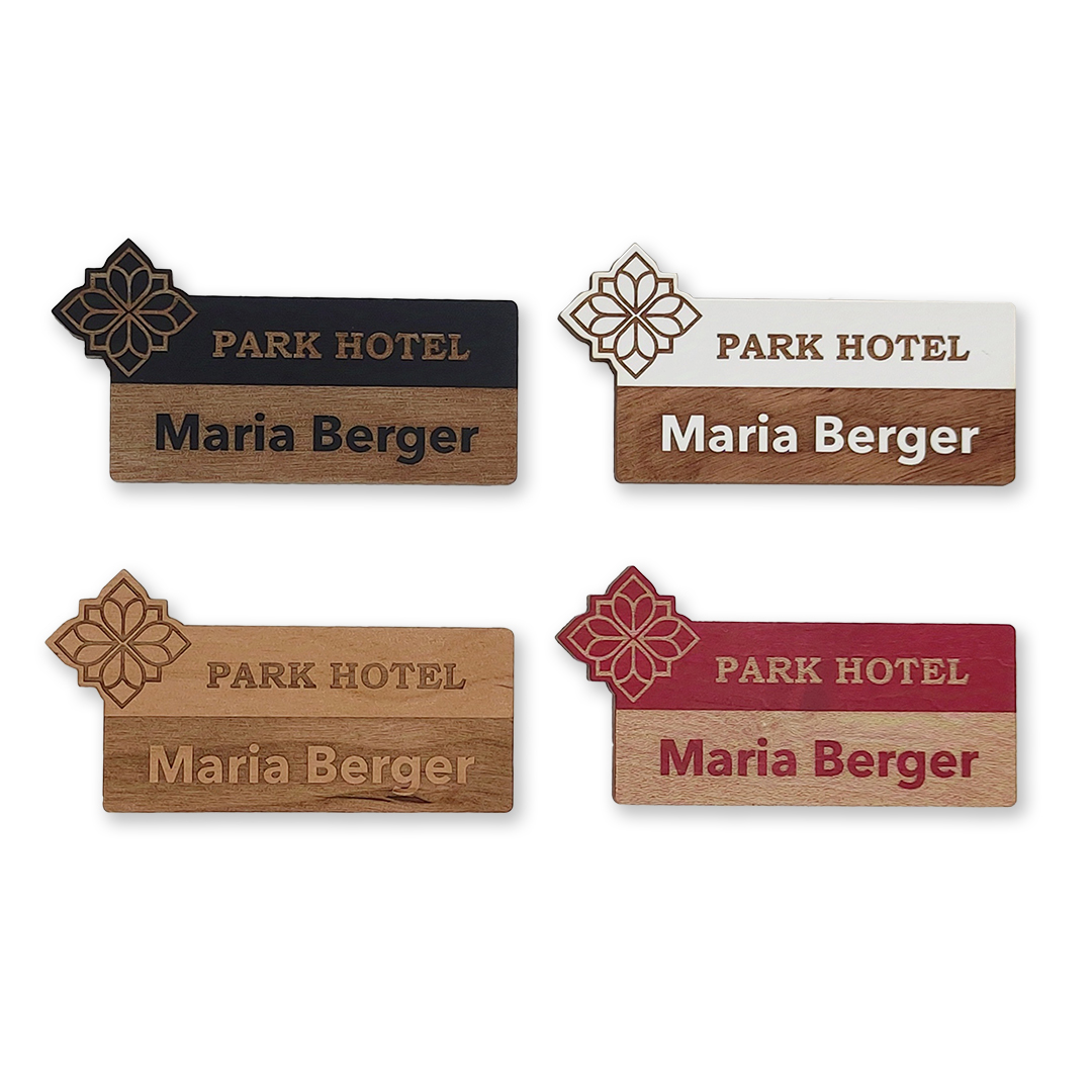 Personalisierte Namensschilder aus Holz ermöglichen deinem Personal einen besseren Kundenkontakt. Denn Holz strahlt Wärme und Geborgenheit aus. An der Hotelrezeption, im Restaurant, am Infostand, während eines Kundenevents oder auf einer Messe. Es gilt immer das Vertrauen der Gäste und Kunden zu gewinnen.
